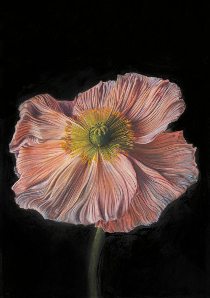 This serene artwork depicts a pale poppy, gently unfurling in soft pastel hues. The delicate shades of peach, pink, and ivory merge gracefully, capturing the quiet beauty of early morning light. Set against a dark background, the flower’s soft, whispering petals contrast with the vibrant yellow-green of its center, embodying calm and balance.